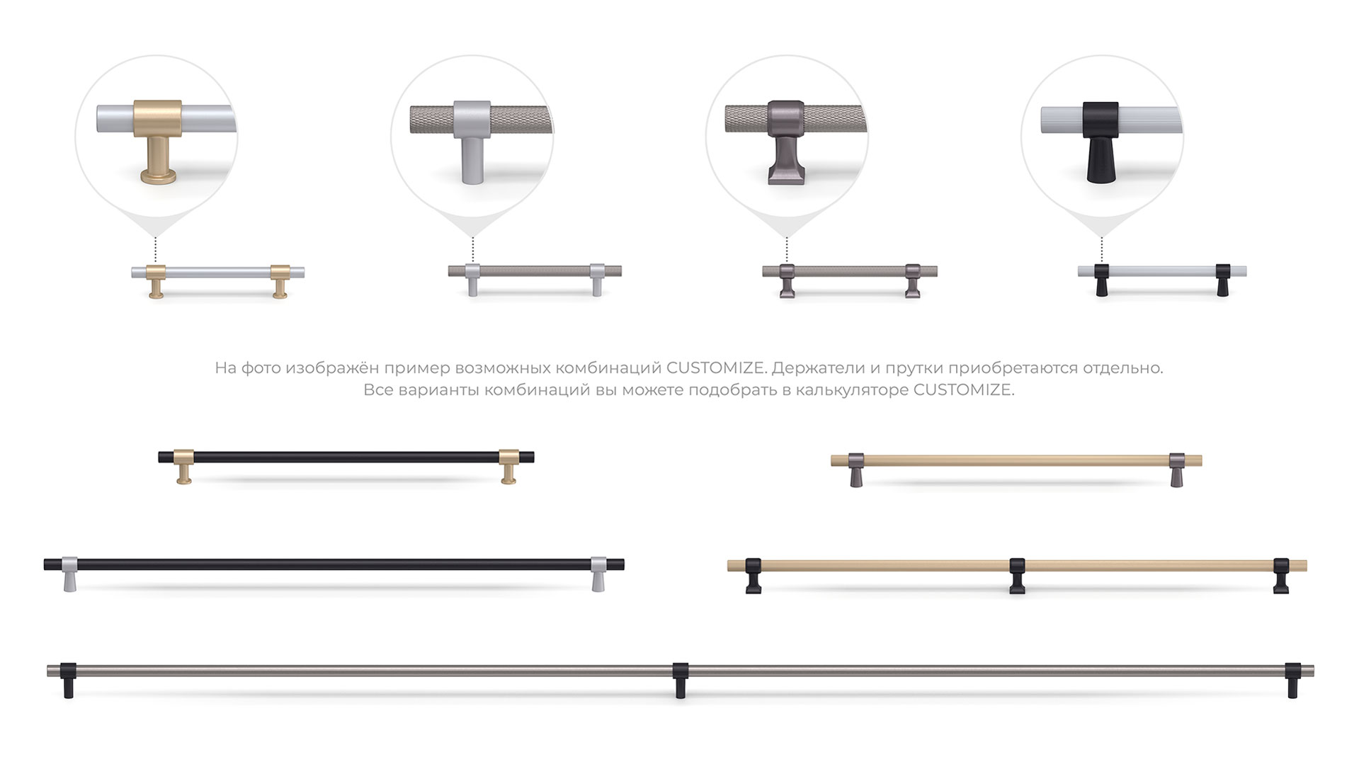 CUSTOMIZE – это серия кастомных ручек, которые клиент создает сам под свой авторский мебельный проект. 4 дизайна держателя мебельной ручки, 3 дизайна прутка, множество длин, трендовые оттенки – всё это открывает огромный простор для стильных творческих экспериментов.