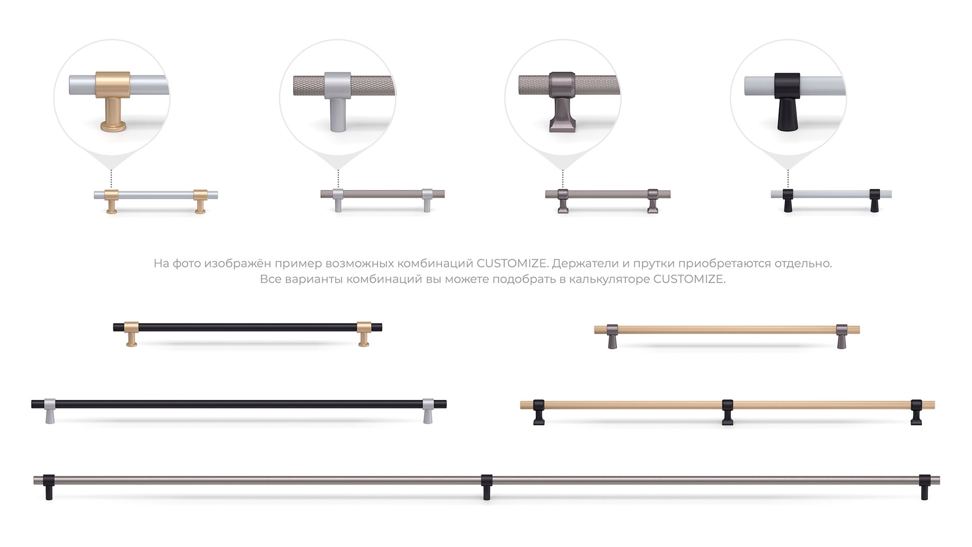 CUSTOMIZE – это серия кастомных ручек, которые клиент создает сам под свой авторский мебельный проект. 4 дизайна держателя мебельной ручки, 3 дизайна прутка, множество длин, трендовые оттенки – всё это открывает огромный простор для стильных творческих экспериментов.