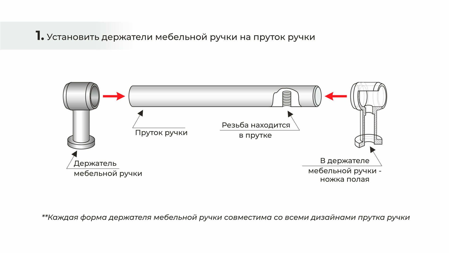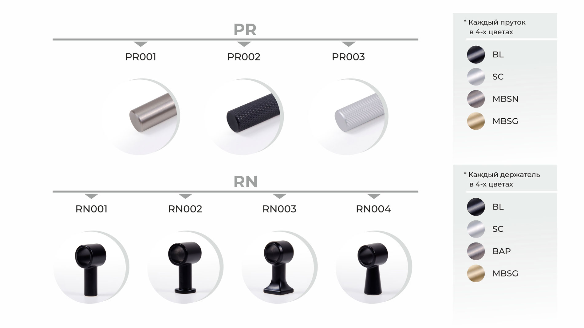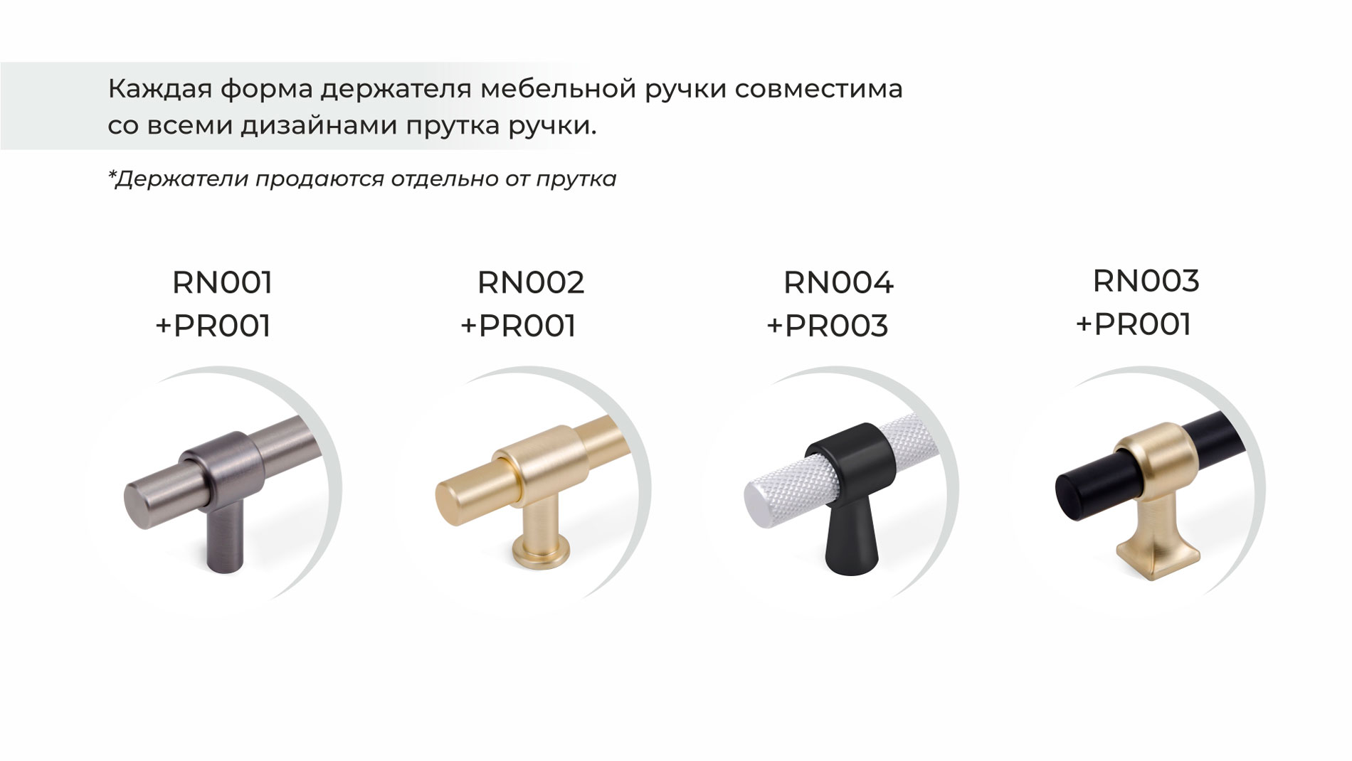 Диаметр отверстия в держателе RN001 рассчитан четко под прутки CUSTOMIZE (NUDE PR001, ROMB PR002, LINE PR003). После закрепления на фасаде готовая ручка стабильно фиксируется в одном положении и не «люфтит» в процессе эксплуатации.