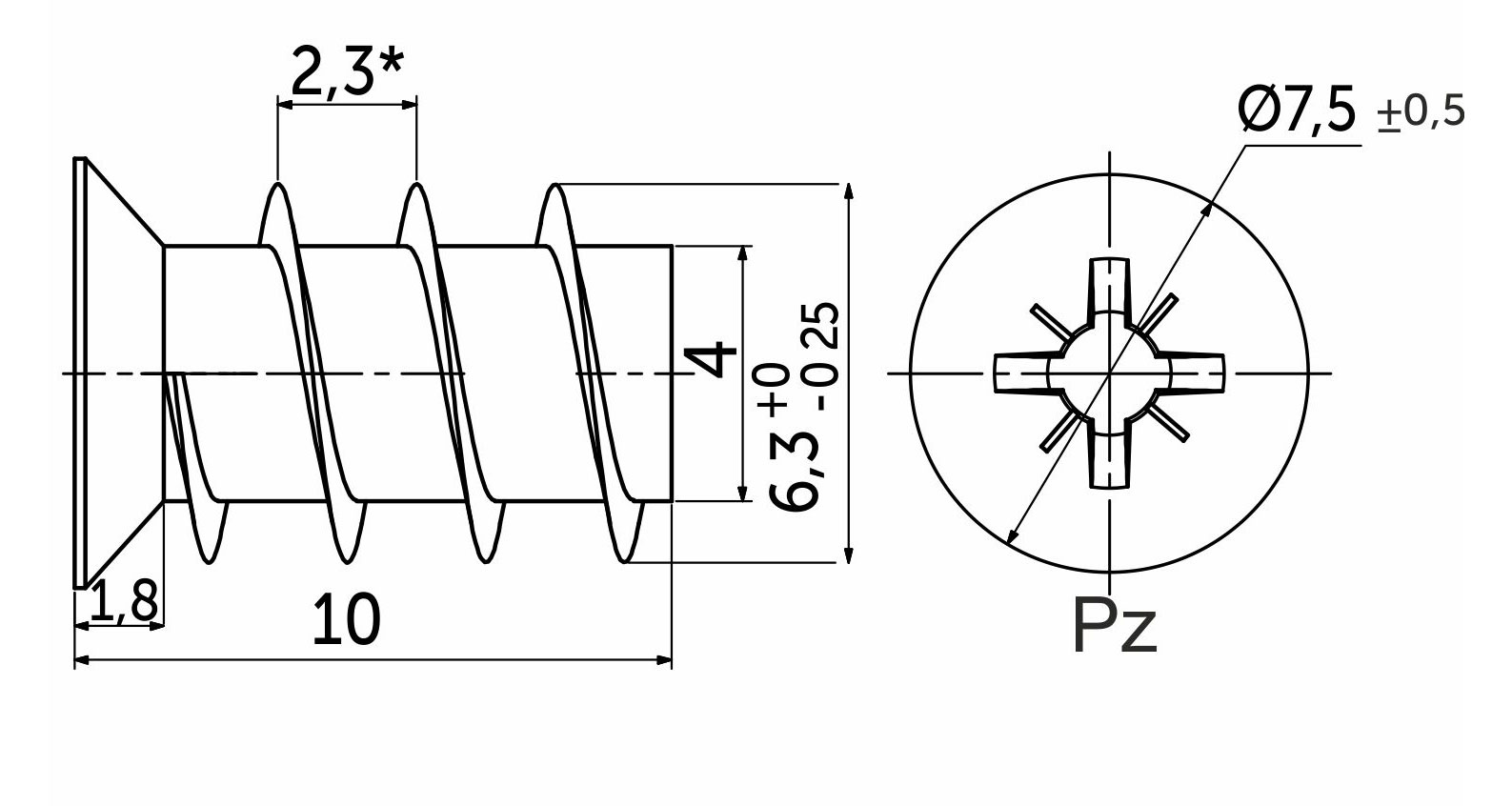 Евро-шуруп (ES) имеет потайную головку, диаметр стержня 6,3 мм и тупой наконечник.