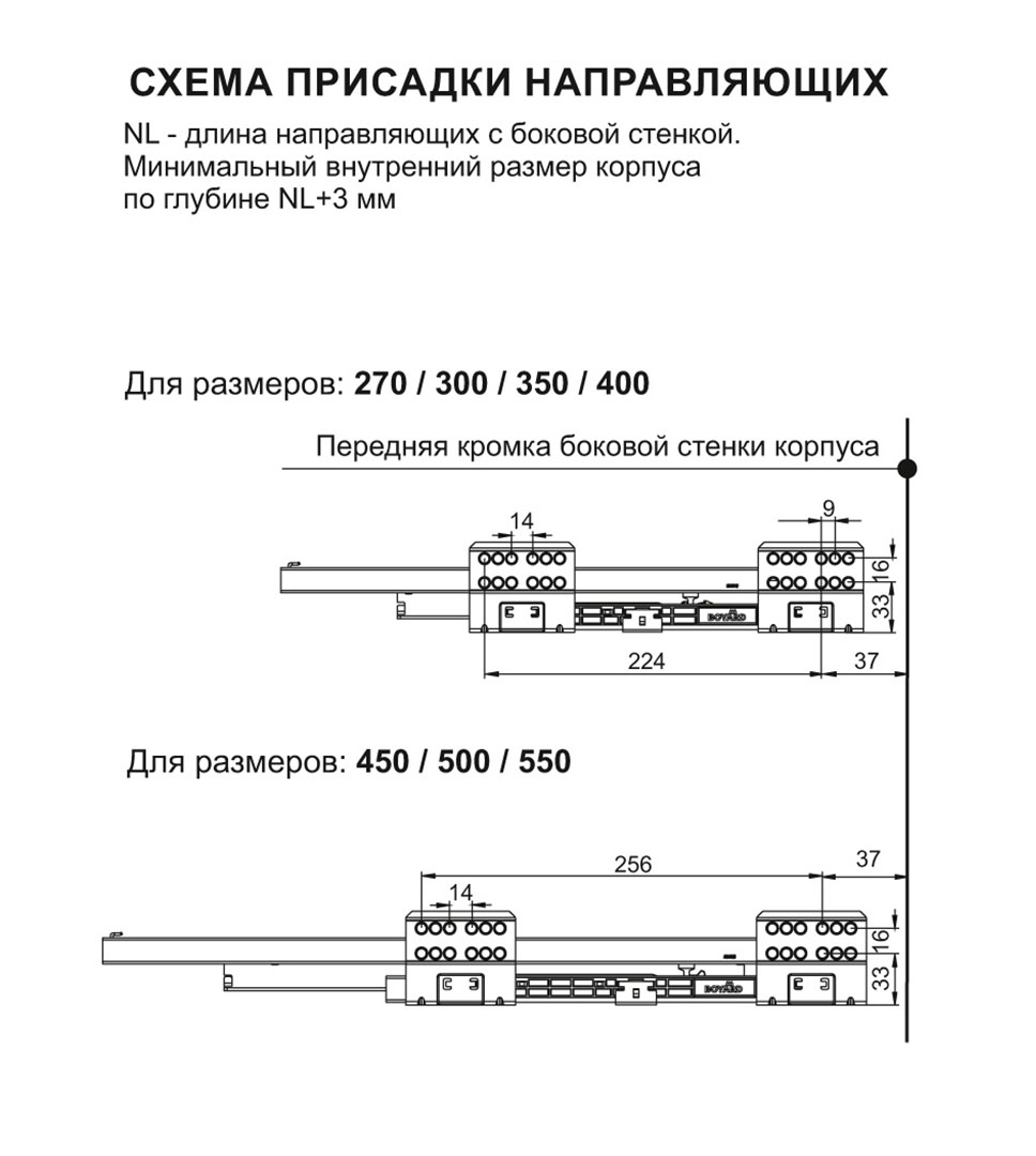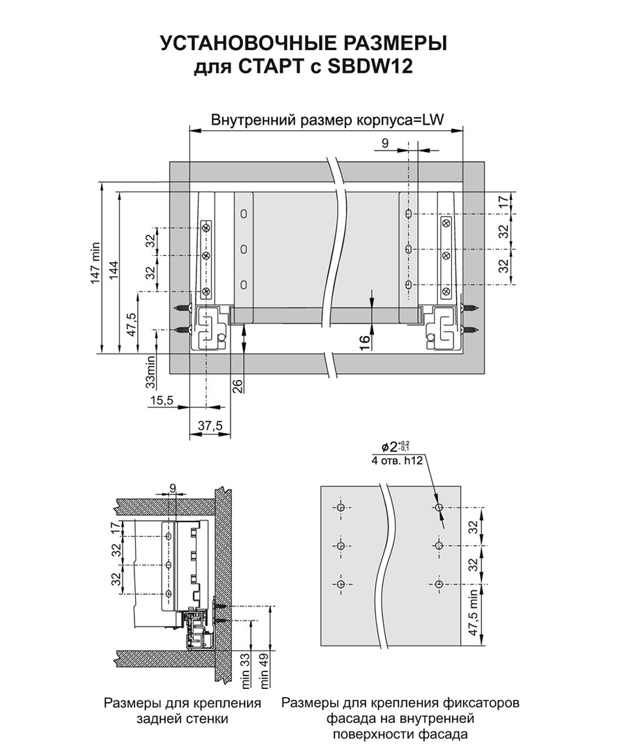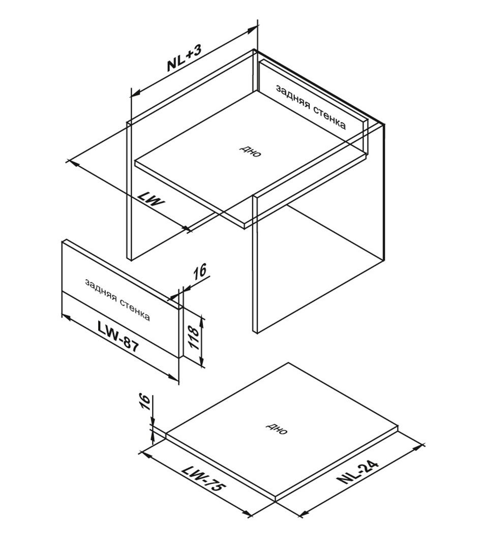 Для сборки выдвижного мебельного ящика с помощью боковин SBDW12 необходимо самостоятельно изготовить фасад, заднюю стенку и дно ящика с учетом собственных пожеланий и потребностей по ширине и высоте готового ящика.