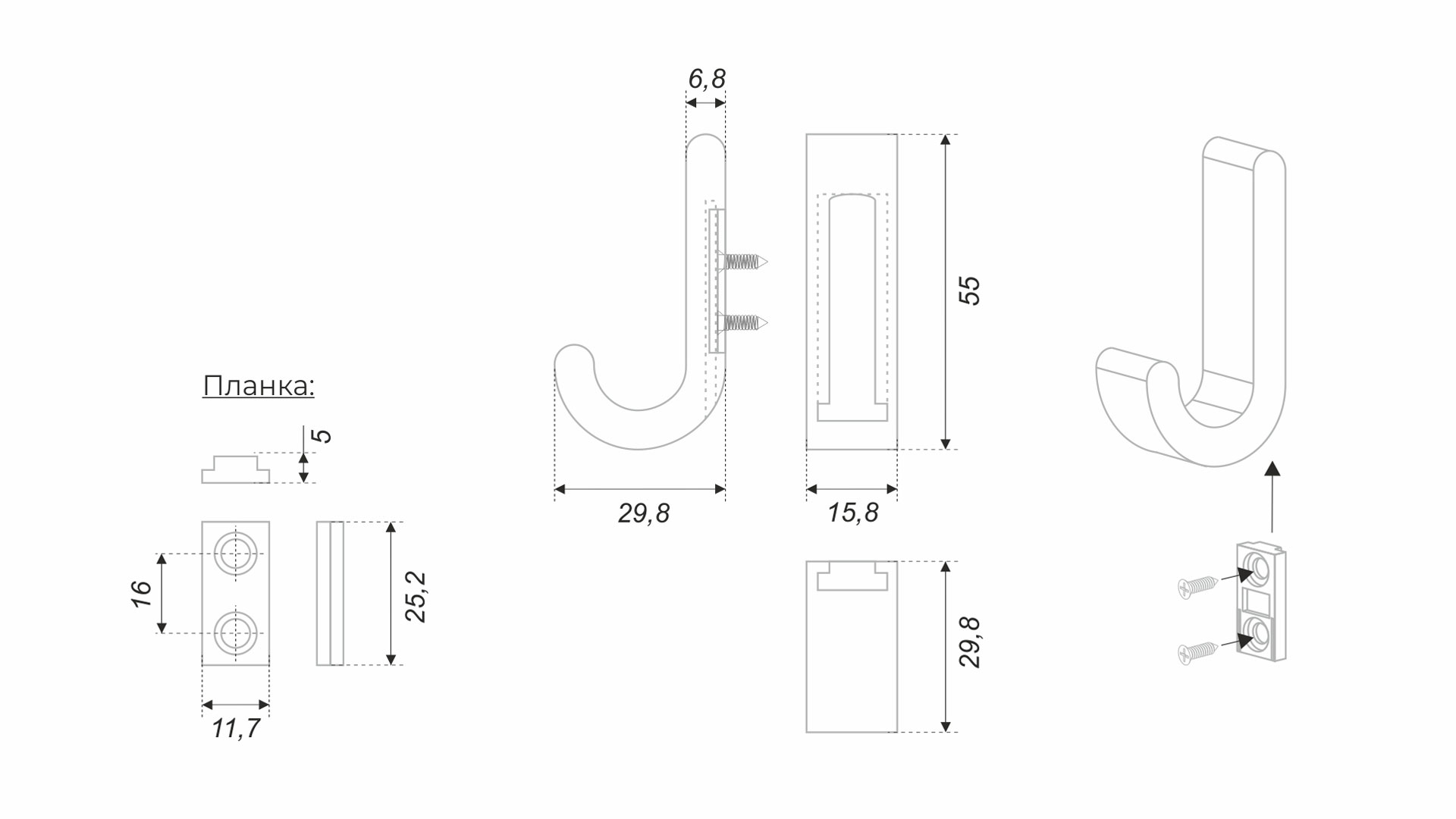 - Крючок «надевается» на планку до упора.
