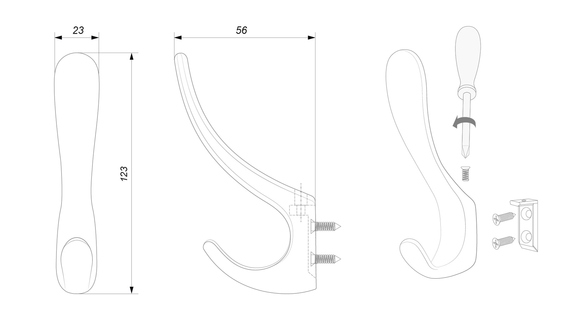 - Комплектация крепежом 1 крючок в полиэтиленовой упаковке, 2 самореза 4x18, крепёжная планка, фиксирующий винт
