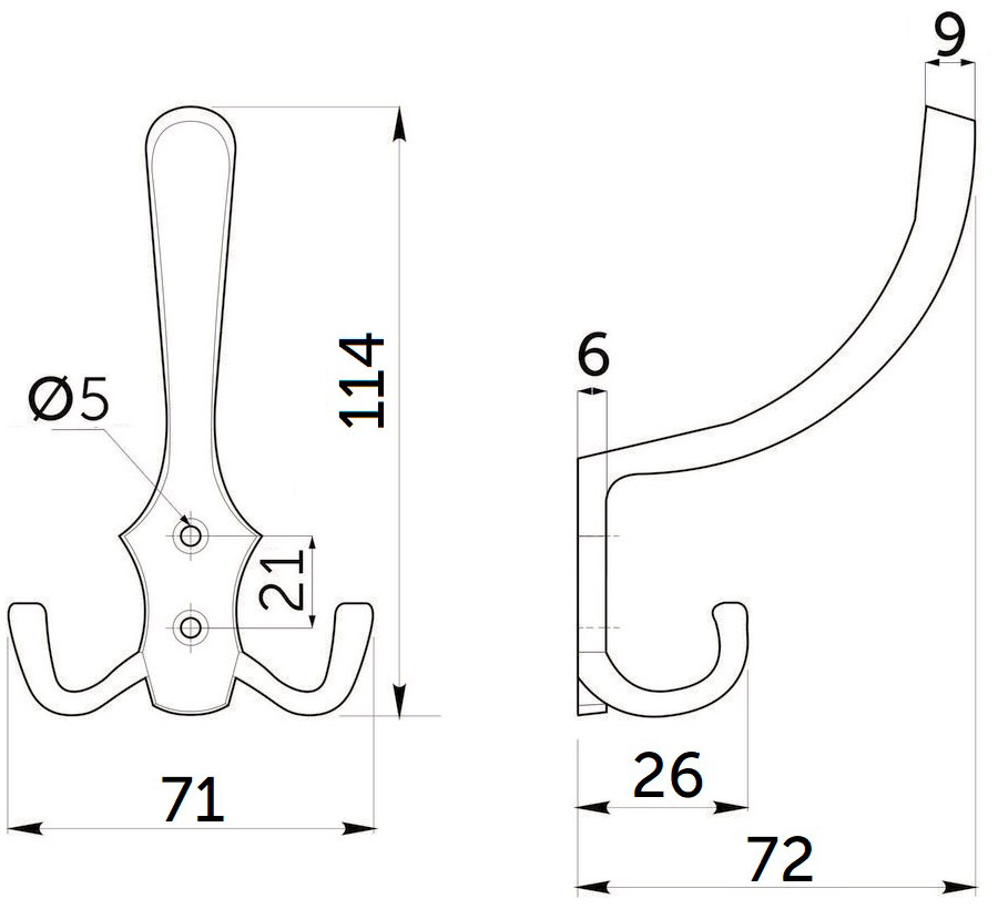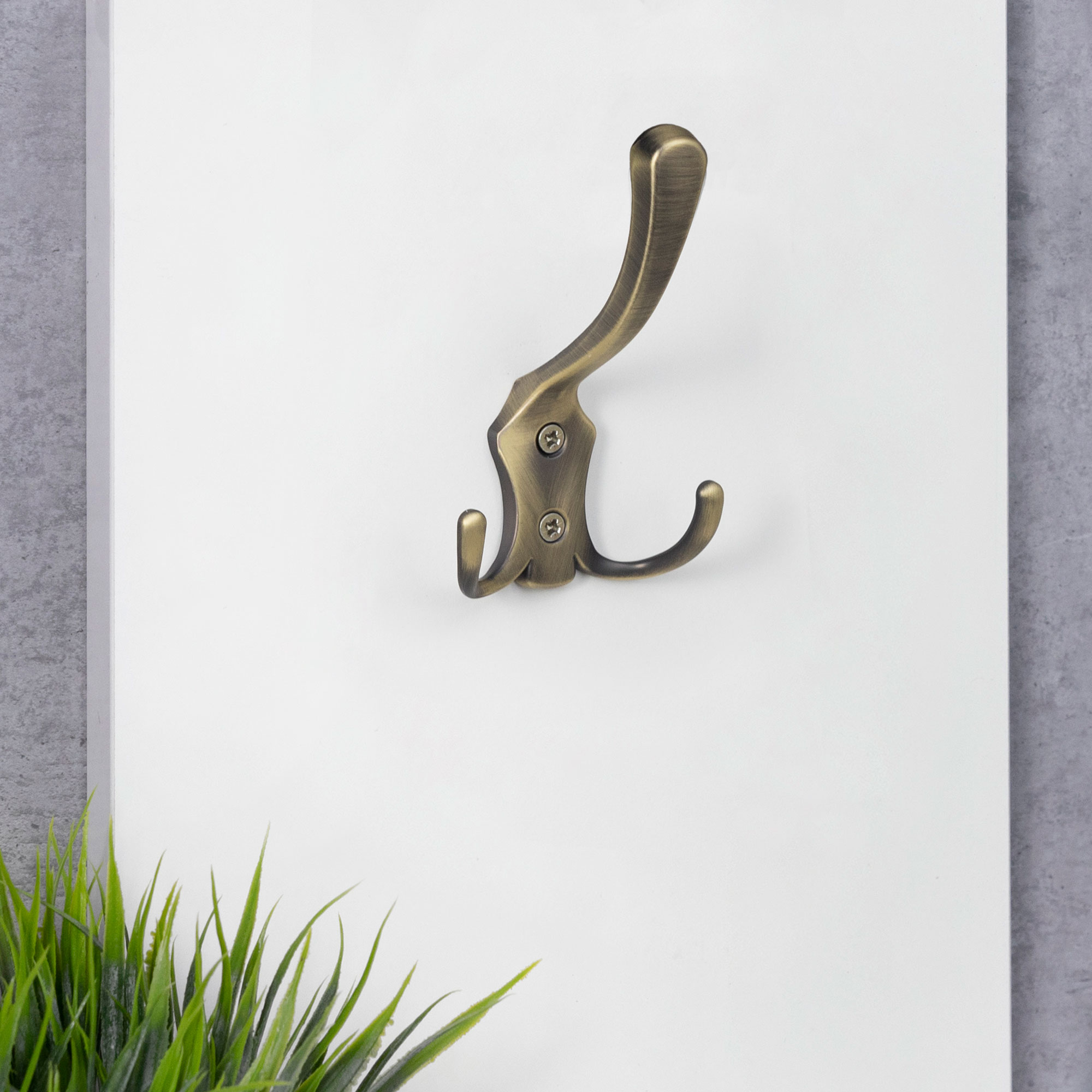 Трехрожковый металлический настенный крючок. Крючок может использоваться как в гардеробных, так и ванной комнате. Крючок имеет стильный минималистичный дизайн, который подойдет практически к любому стилю интерьера.