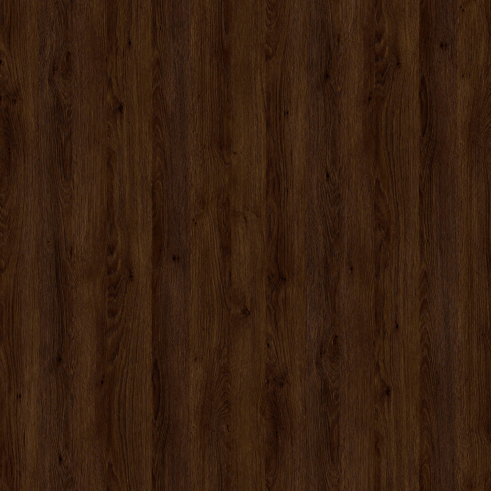 - Декор выполнен в интенсивной, теплой коричневой гамме, часто с выраженным рыжеватым или медовым оттенком. Он имитирует древесину дуба с заметными, контрастными темными и светлыми волокнами и годичными кольцами.