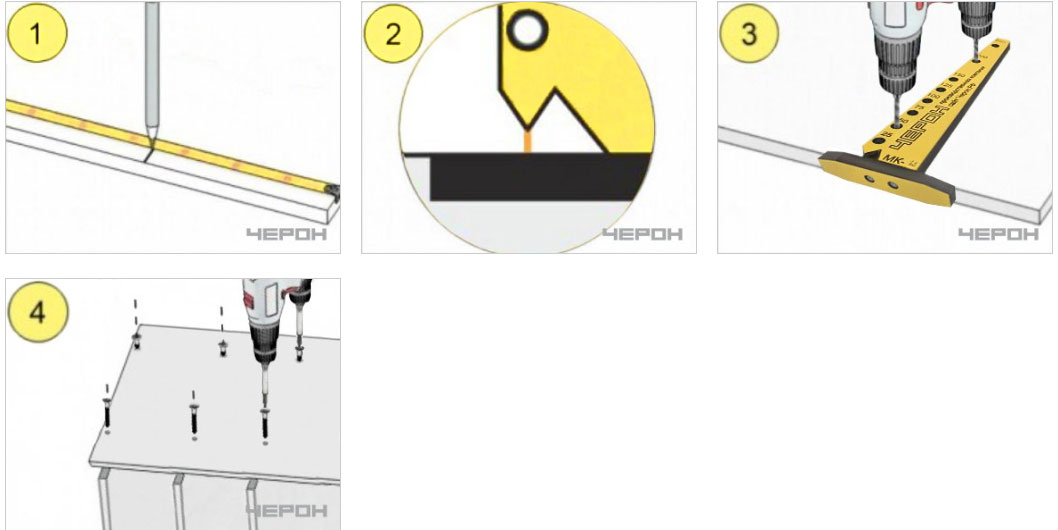 2. Приложите мебельный кондуктор, совместив носик с отметкой на детали.