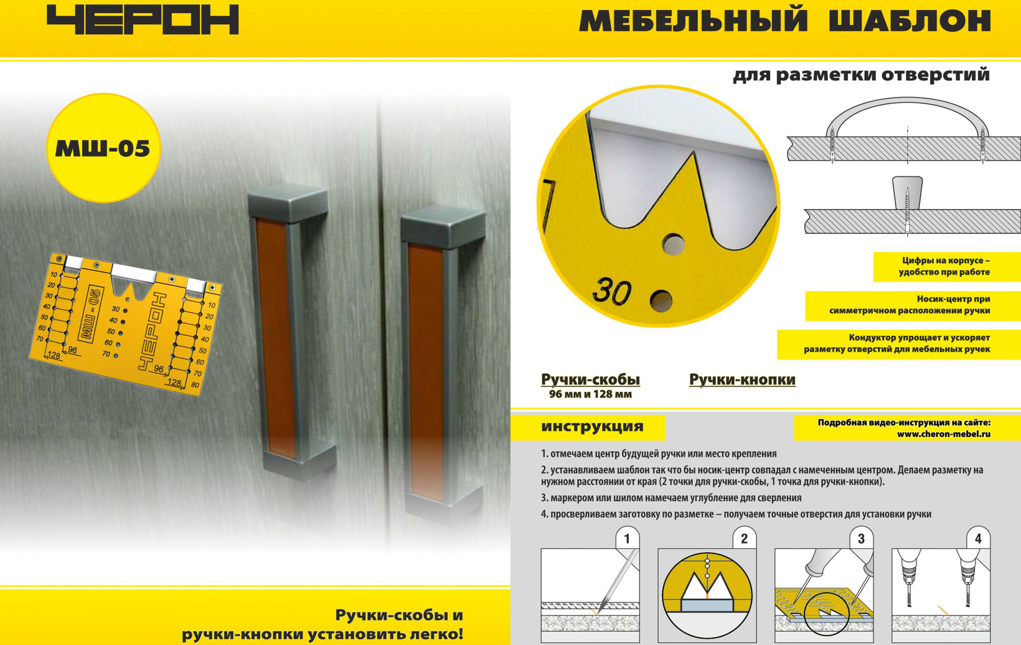 Назначение: Шаблон для мебельных ручек. Служит для разметки отверстий под ручки-кнопки и ручки-скобы (96 мм и 128 мм)