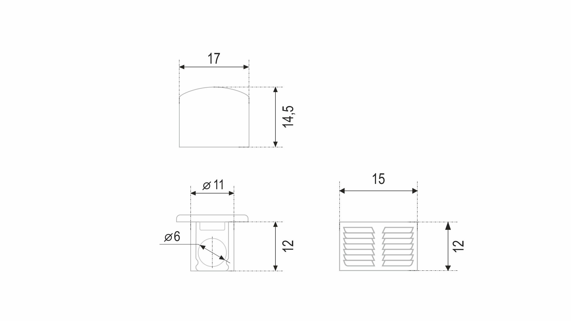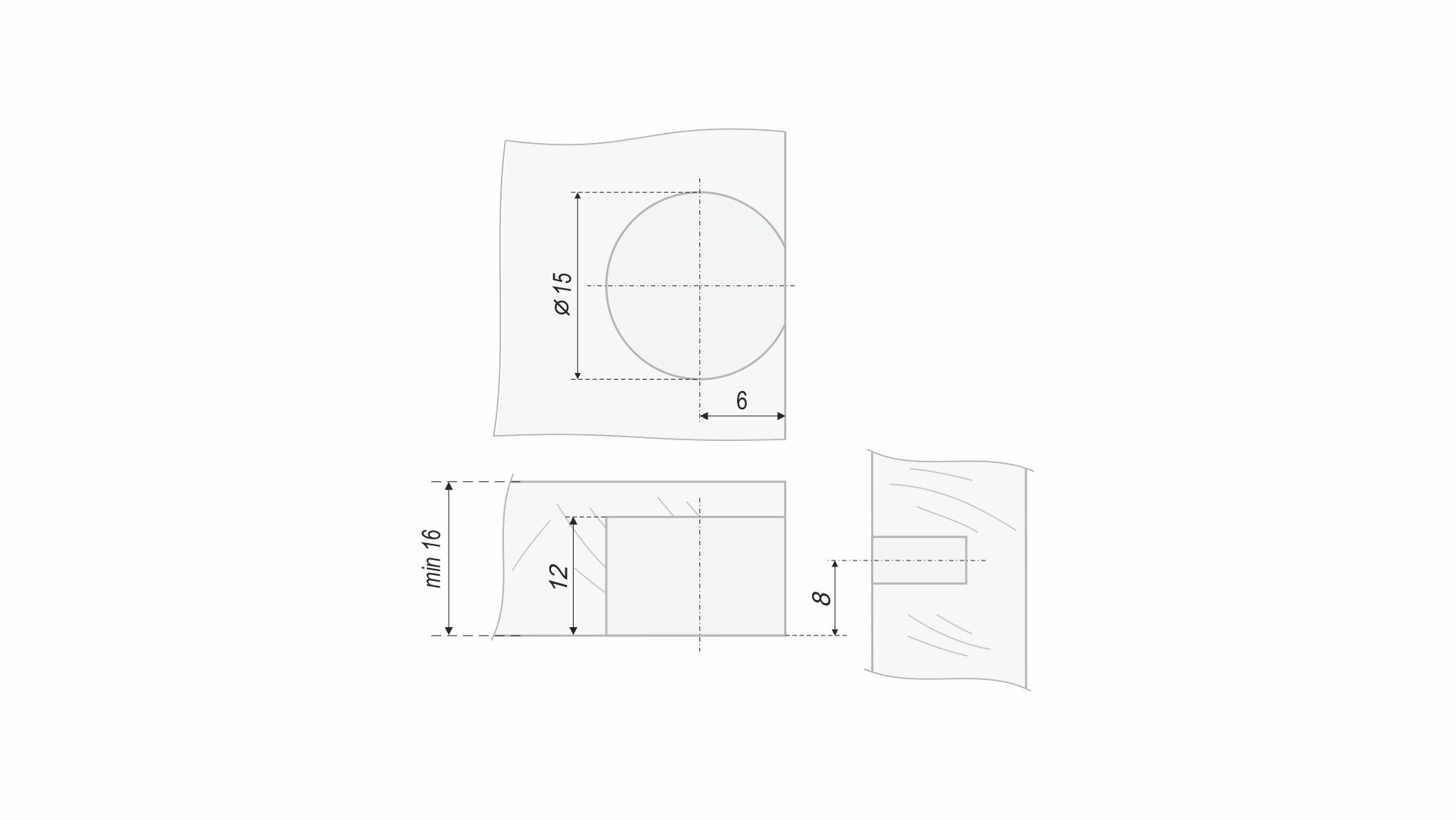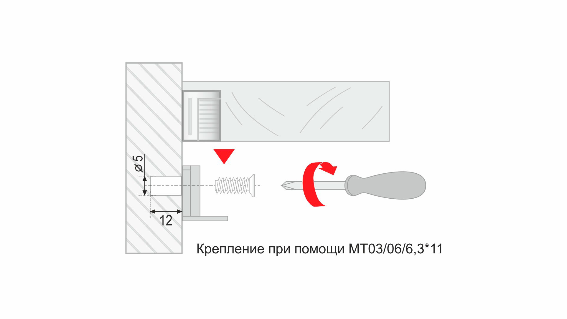 Для монтажа полки необходимо в плитном материале подготовить отверстие 15х12 мм, установить пластиковый корпус полкодержателя, прикрепить металлический фланец к боковой стенке мебели на саморез или евровинт MT03/06/6,3*11Cr/0 и надеть полку на фланцы.