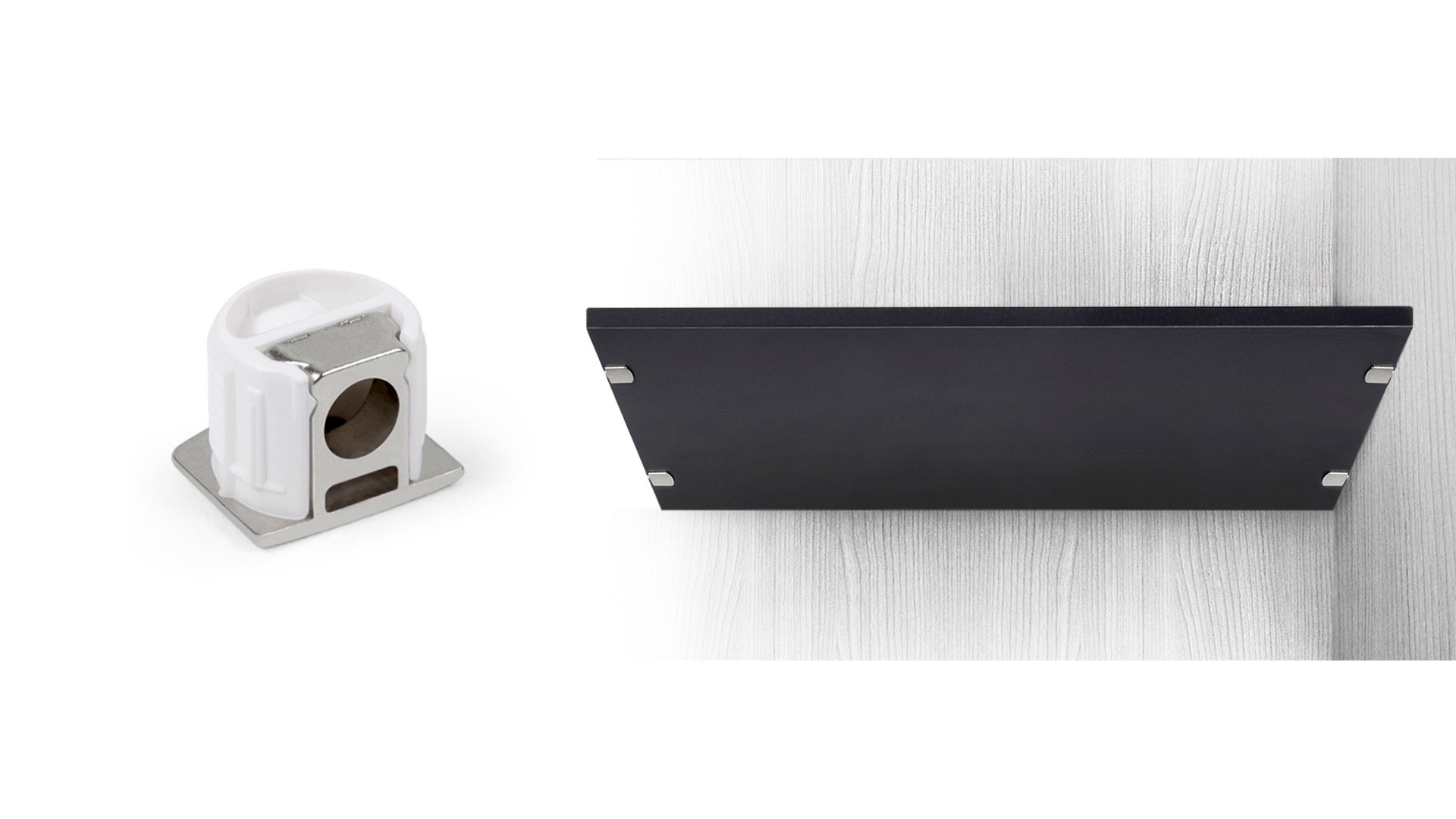 Полкодержатель предназначен для монтажа полок толщиной от 16 мм в мебельные модули любого стиля и направления. Металлический фланец полностью скрывает пластиковые элементы полкодержателя, оставляя на виду лишь лаконичную часть детали.