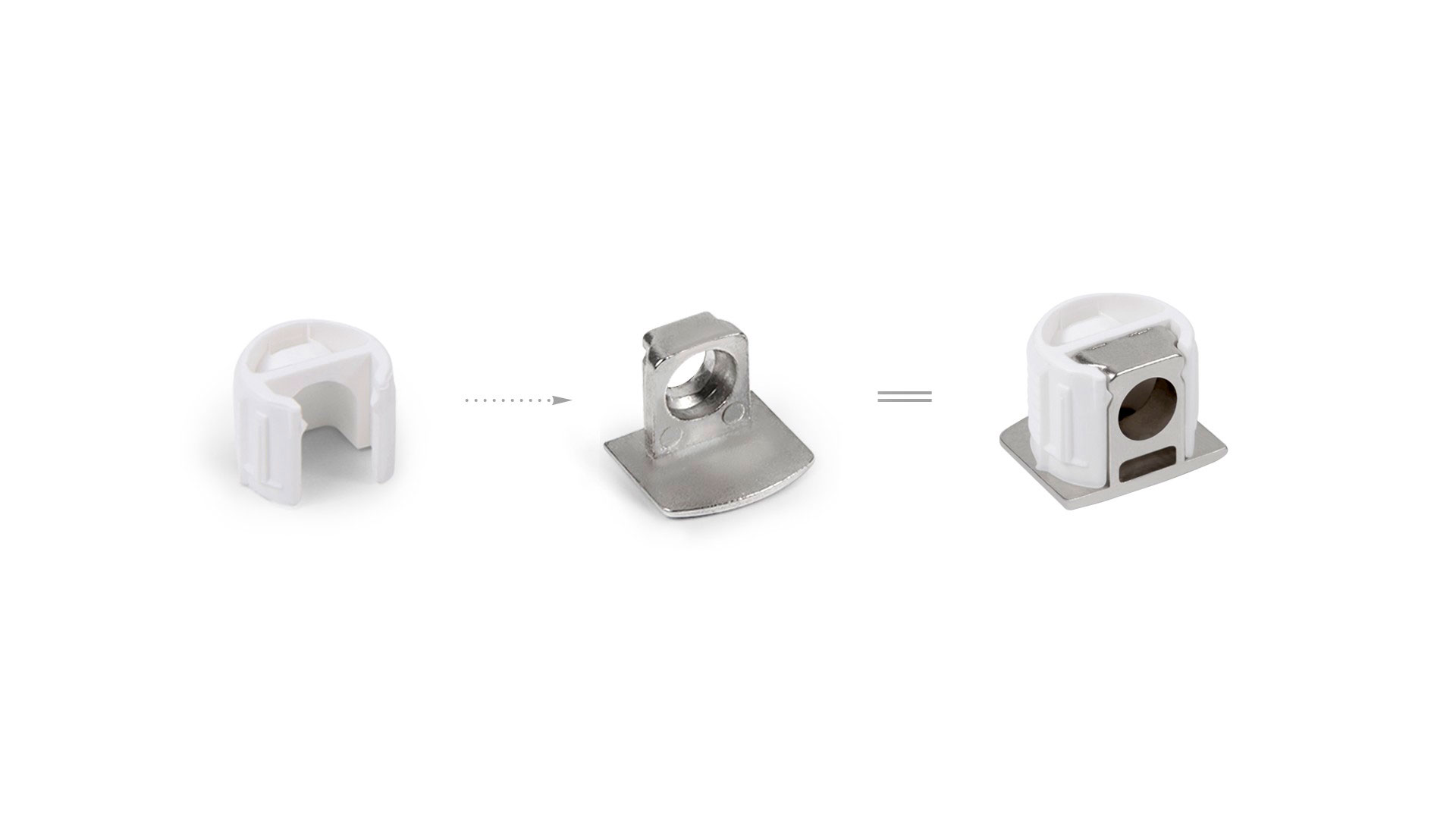 Рёбра по окружности пластикового корпуса служат для плотной фиксации держателя в полке, особая конструкция полкодержателя прочно закрепляет полку на фланце, а разборное соединение удобно для пробной сборки, хранения и перевозки мебели.