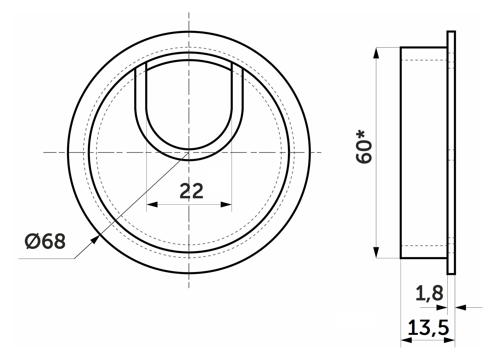 Габаритный диаметр изделия 68 мм, размеры отверстия в столешнице - d60 мм.