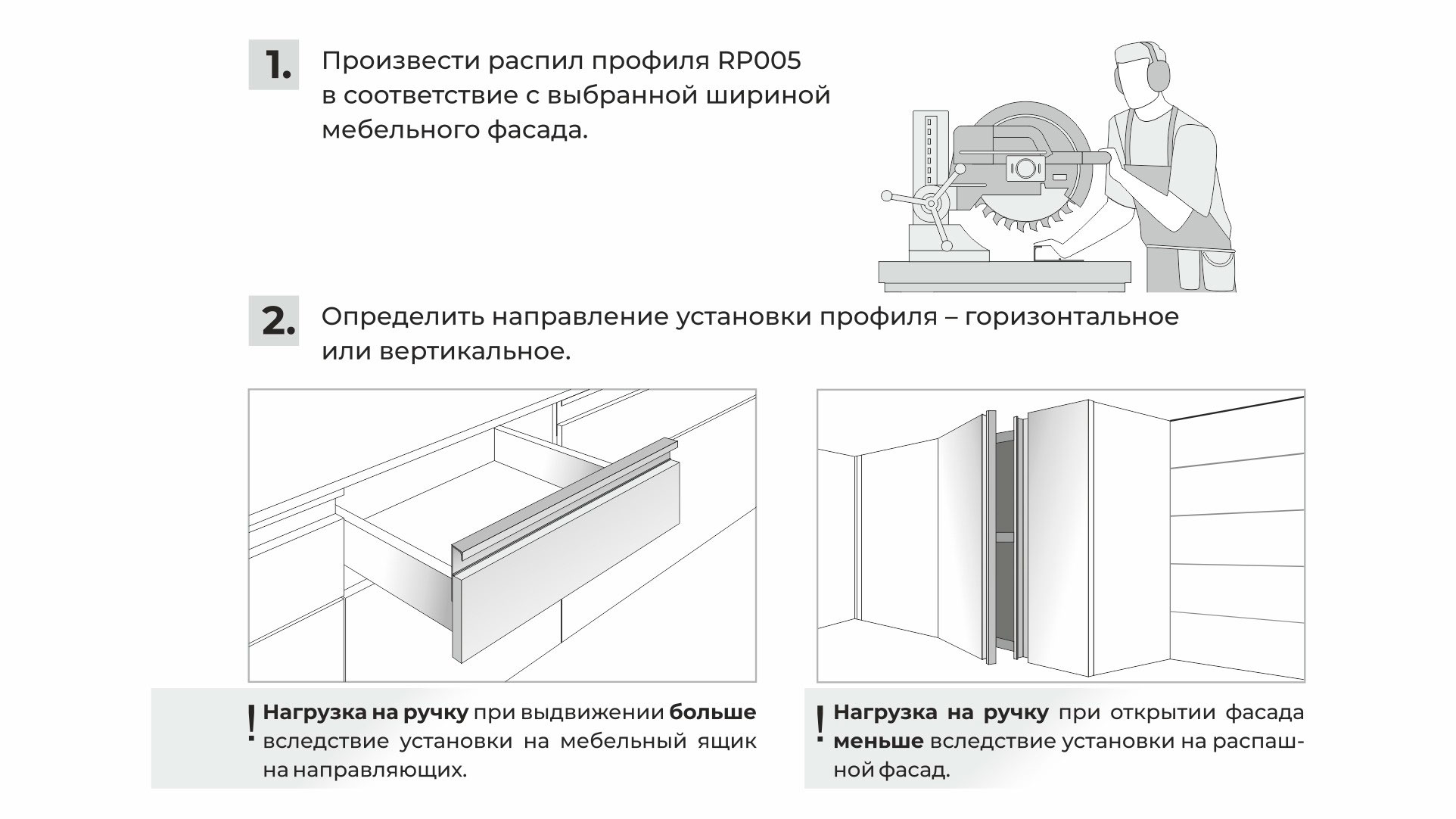 Монтаж ручки не требует дополнительной фрезеровки, профиль накладывается на фасад и закрепляется саморезами с задней стороны. Быстро и просто! Подходит для фасадов любой толщины.