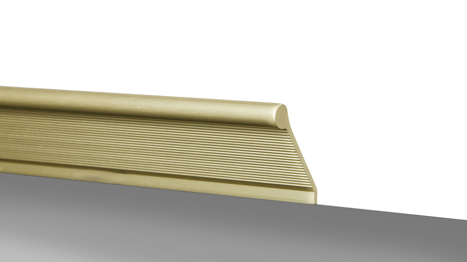 METRICA RT112 — торцевая ручка из алюминия, с геометричным выступом и рифлением в зоне захвата для эргономичного использования. Устанавливается наложением, подходит для фасадов толщиной от 16 мм до 20 мм.
