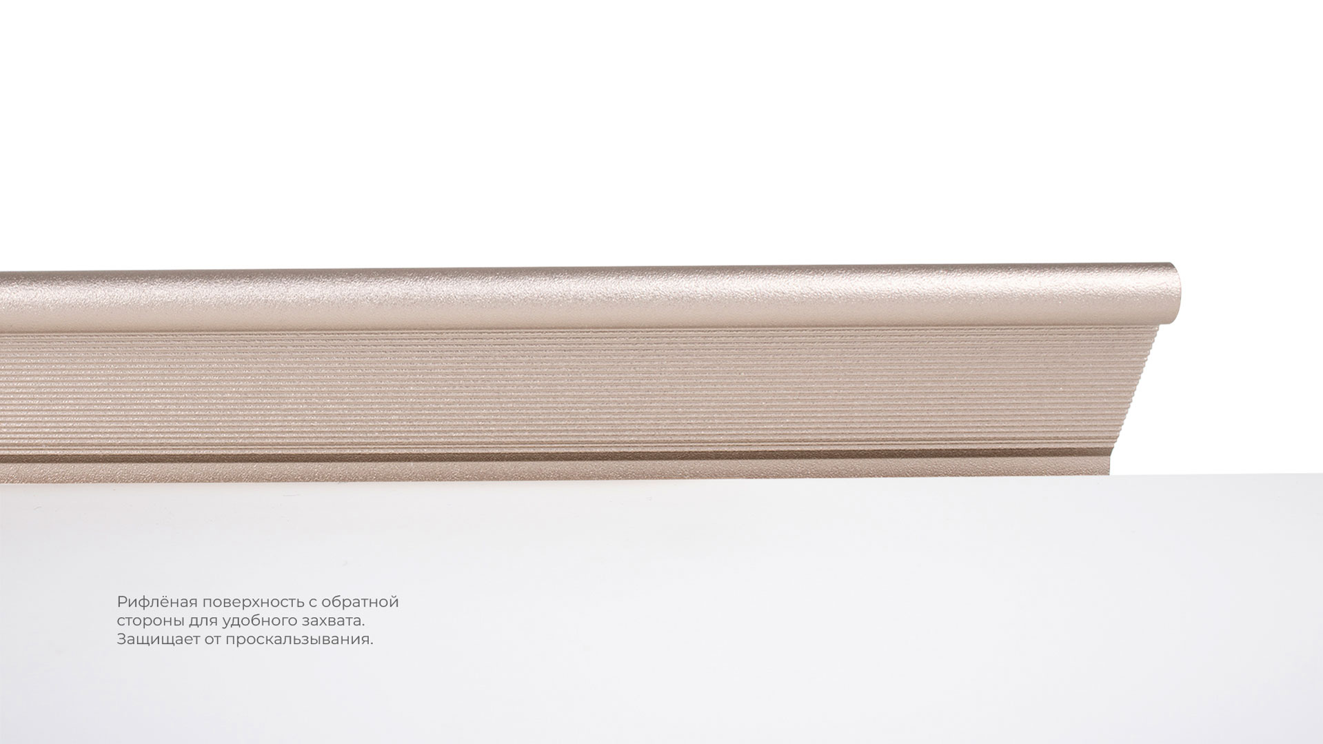METRICA RT112 — торцевая ручка из алюминия, с геометричным выступом и рифлением в зоне захвата для эргономичного использования. Устанавливается наложением, подходит для фасадов толщиной от 16 мм до 20 мм.