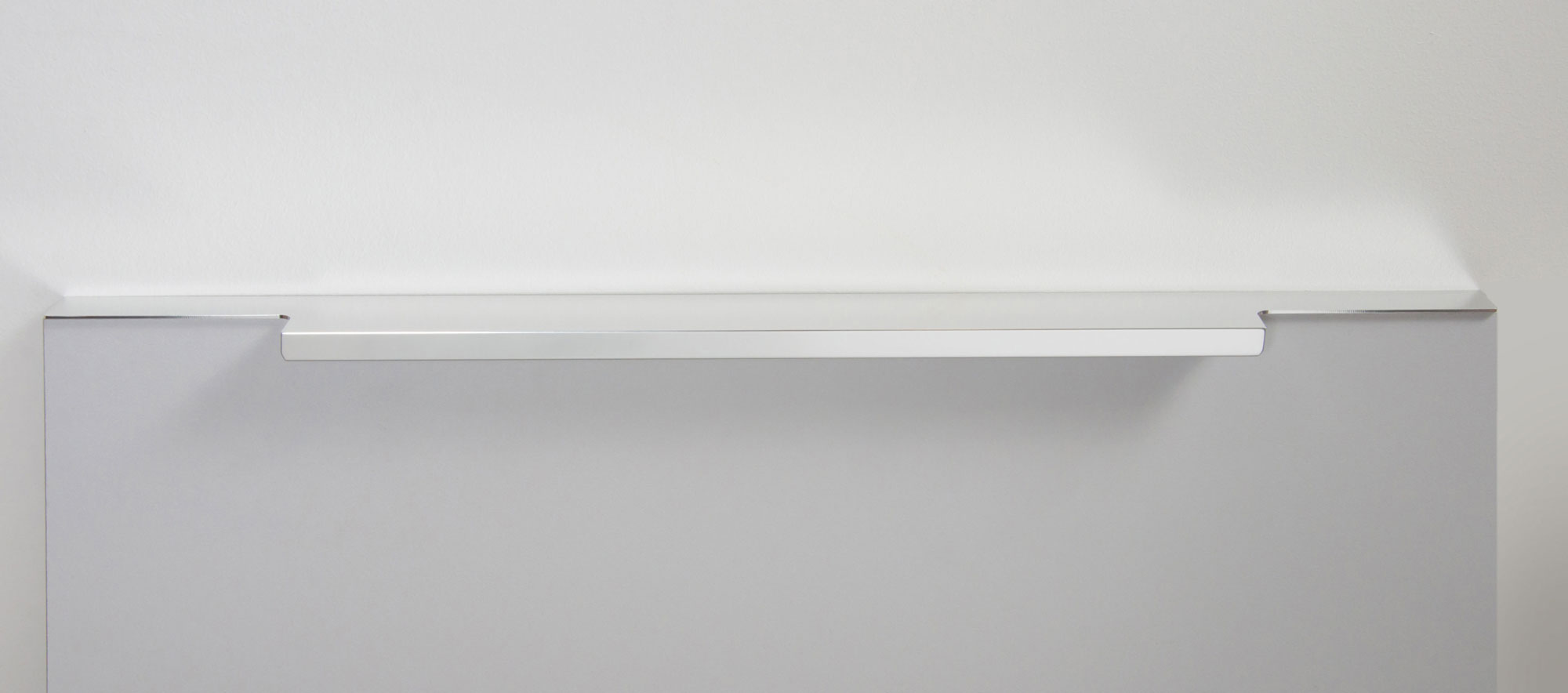 Ручка имеет богатую палитру цветовых решений и разнообразие длин. В зависимости от длины, модель допускает размещение двумя способами — «в размер» фасада и по центру широких фасадов (как большой «язычок»).