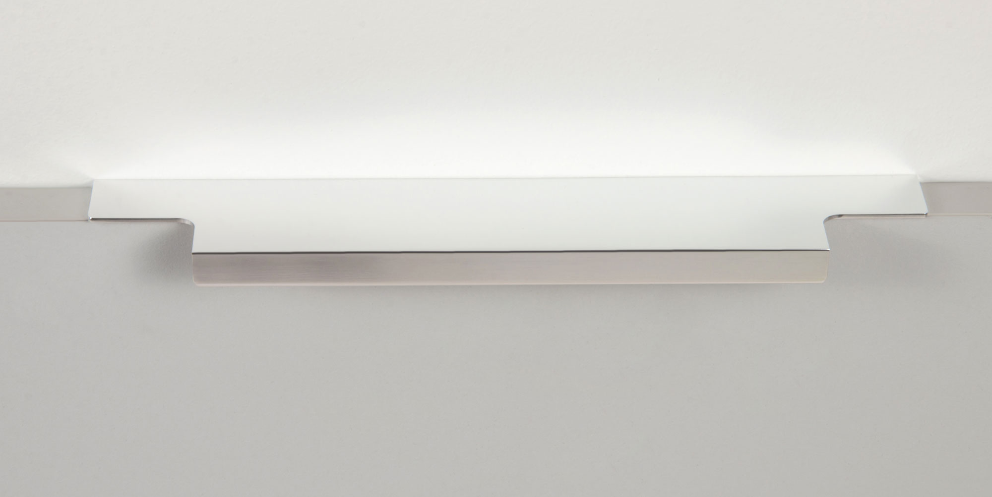 Ручка имеет богатую палитру цветовых решений и разнообразие длин. В зависимости от длины, модель допускает размещение двумя способами — «в размер» фасада и по центру широких фасадов (как большой «язычок»).