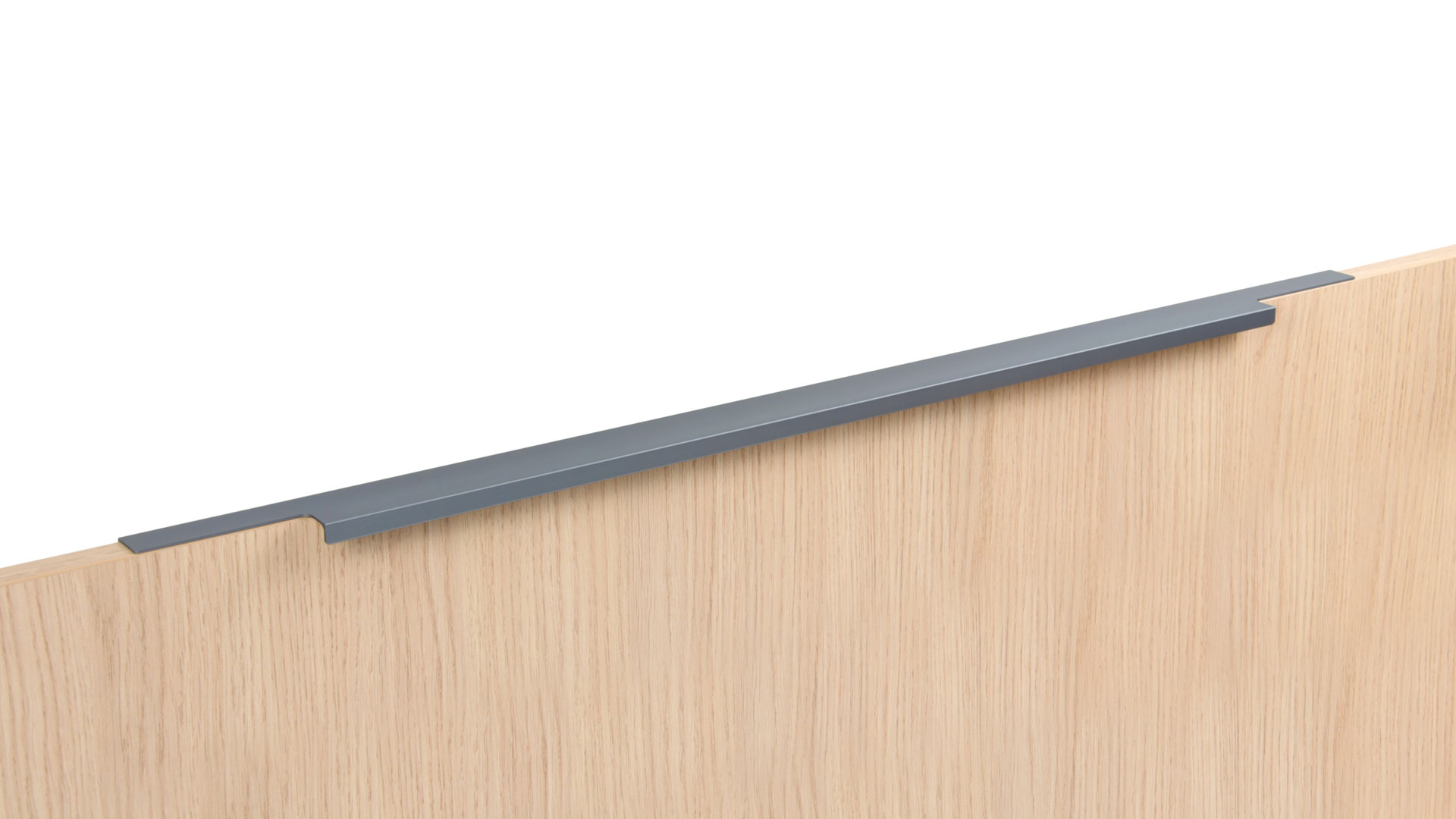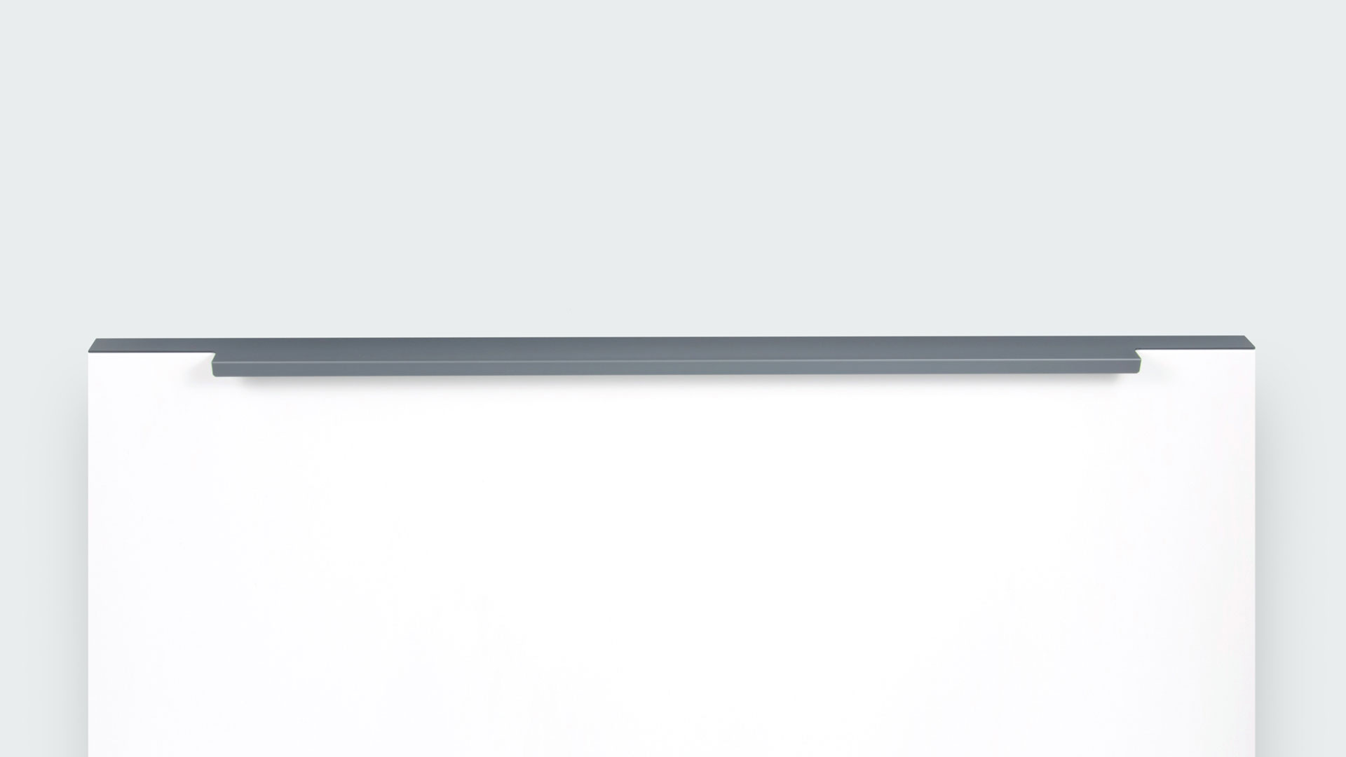 Ручка имеет богатую палитру цветовых решений и разнообразие длин. В зависимости от длины, модель допускает размещение двумя способами — «в размер» фасада и по центру широких фасадов (как большой «язычок»).