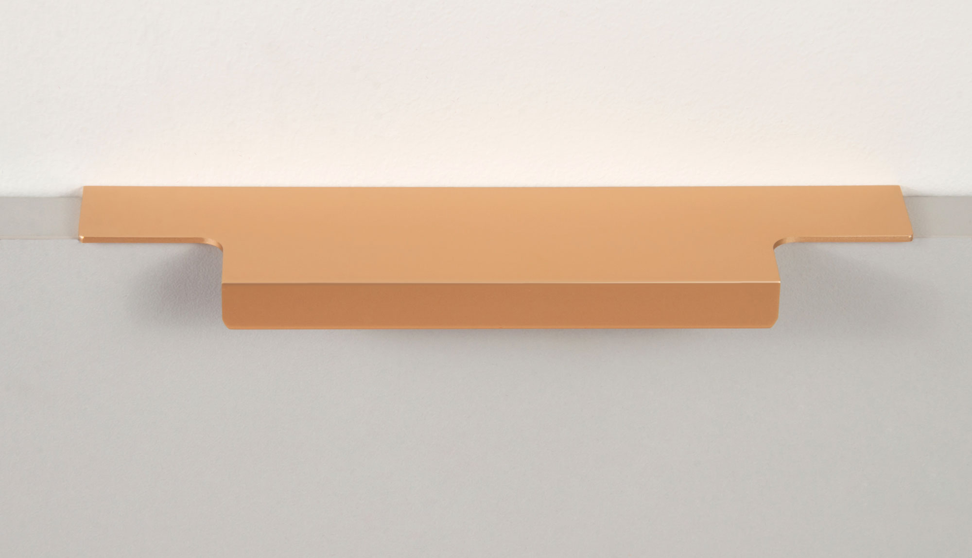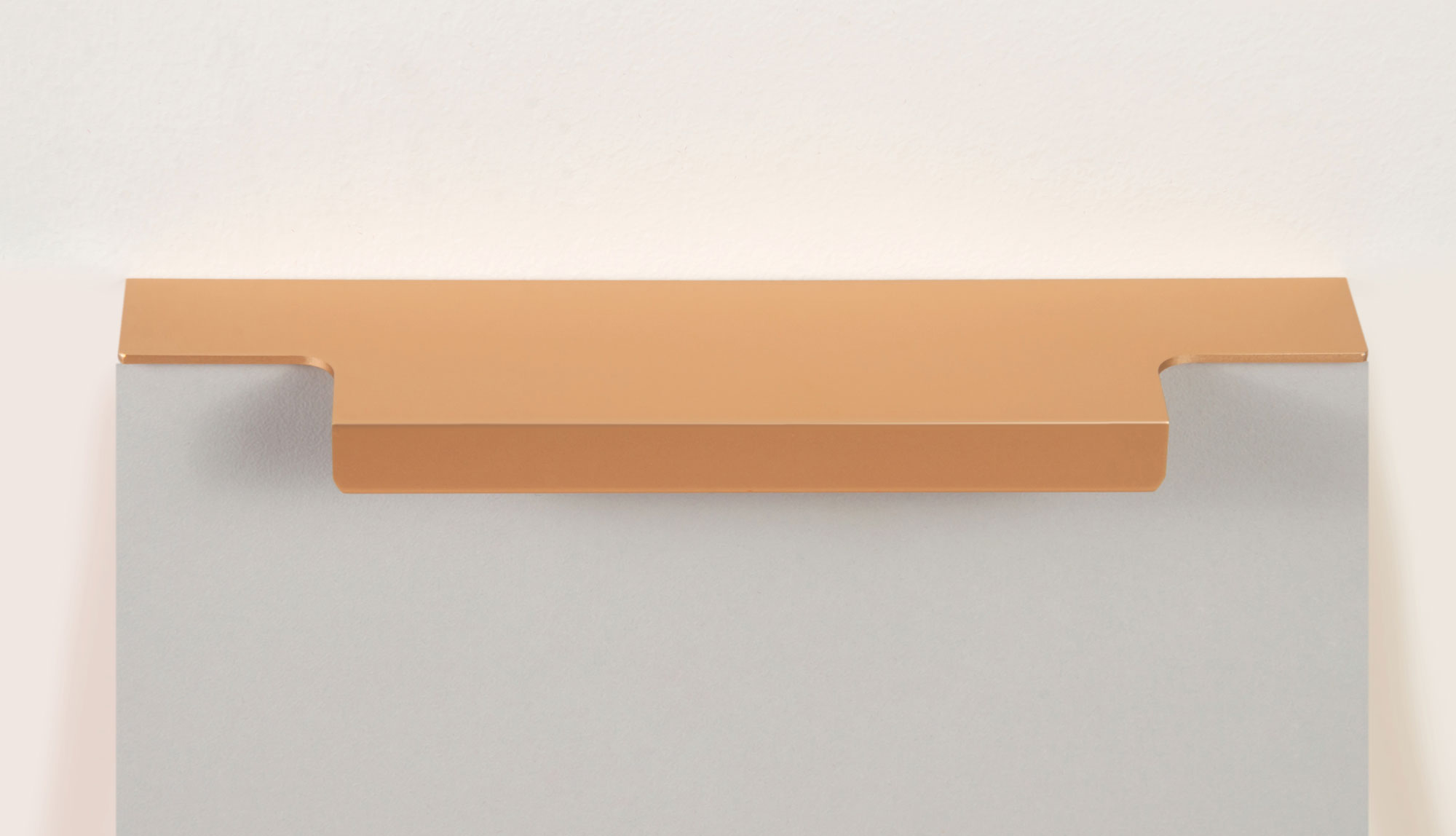 Ручка имеет богатую палитру цветовых решений и разнообразие длин. В зависимости от длины, модель допускает размещение двумя способами — «в размер» фасада и по центру широких фасадов (как большой «язычок»).