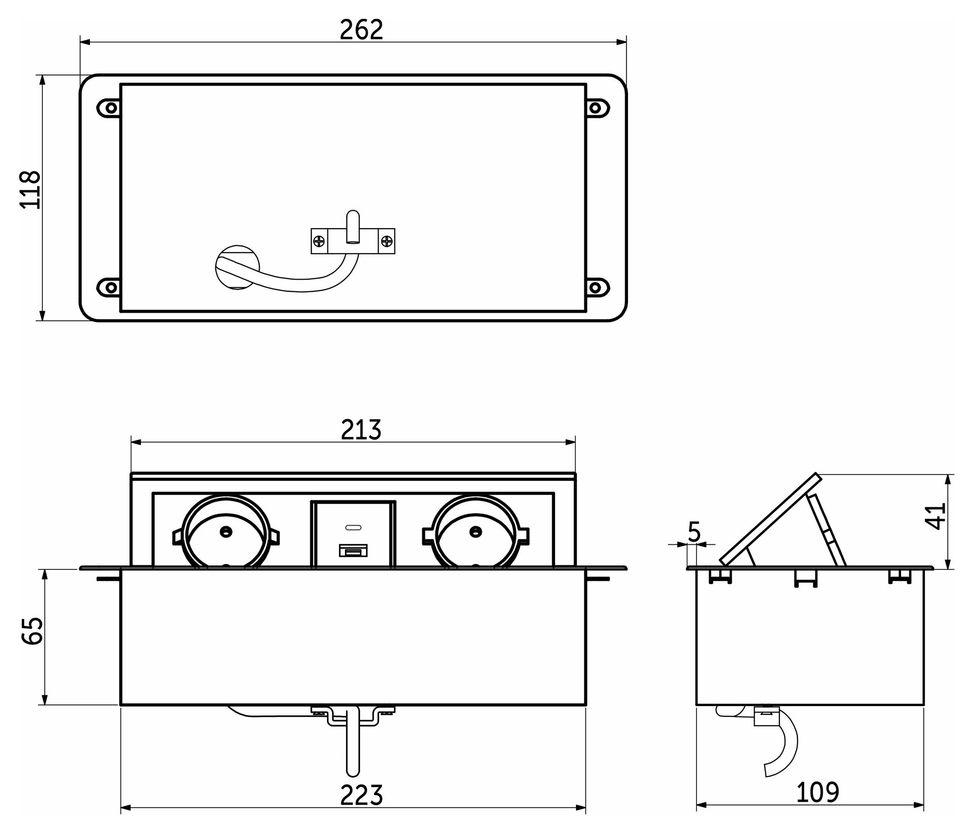 Наружный размер 266х133х67мм, монтажный размер 223х109х65мм, степень защиты IP20, длина кабеля 2м, электробезопасность 16A с заземлением и проводами с поперечным сечением 1,5 mm². 3 евророзетки с заземлением 220В (Schuko), цвет белый.