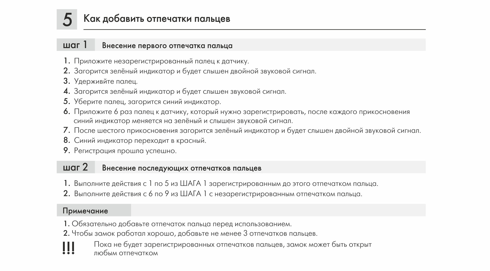 Модель обладает высокочувствительным быстро реагирующим биометрическим датчиком. К замку можно настроить до 20 отпечатков пальцев. До момента настройки замок может открыть любой отпечаток.