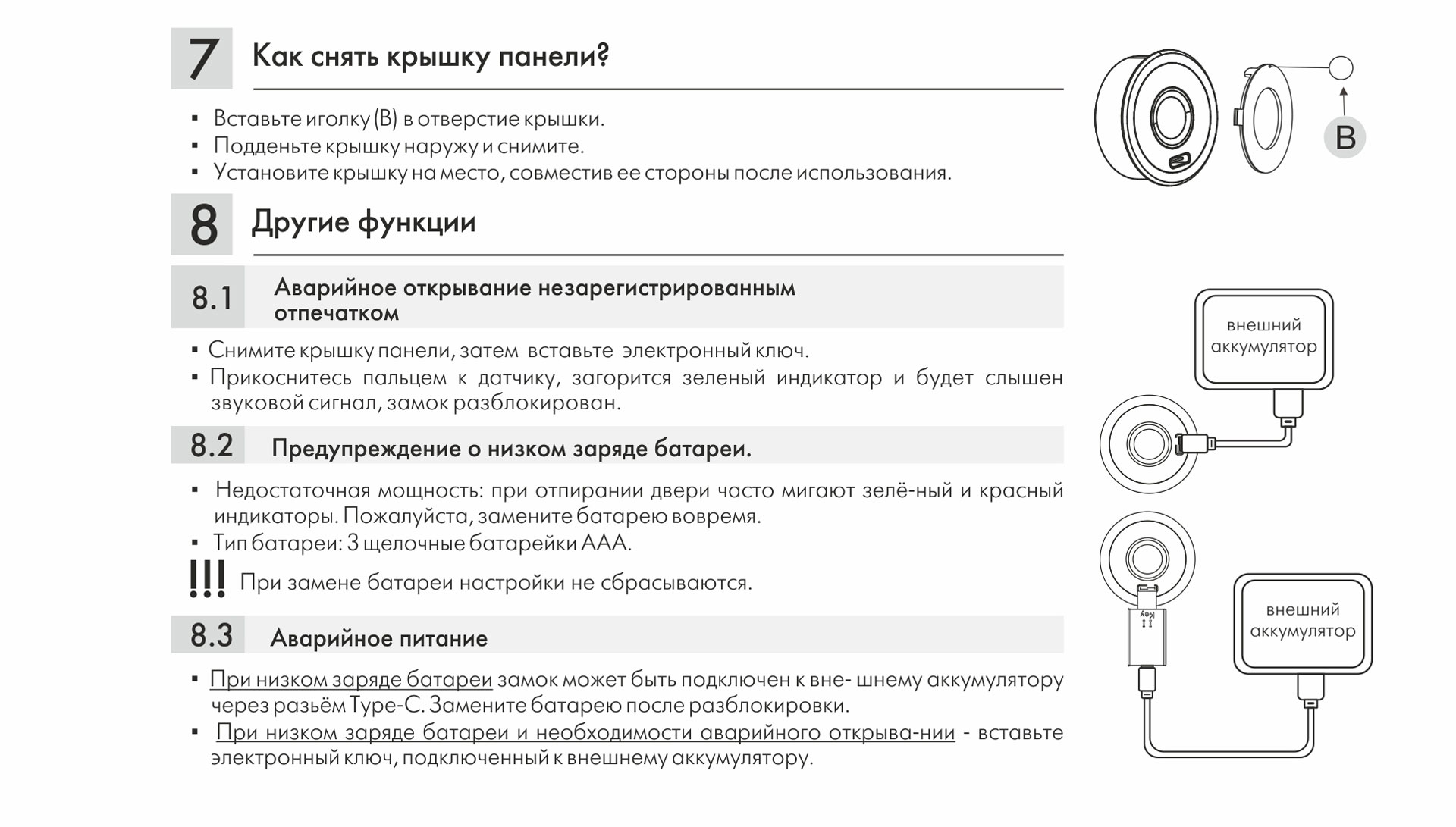 Если ранее настроенные к замку отпечатки утрачены, замок может быть открыт с помощью электронного ключа через разъем Type-C.
