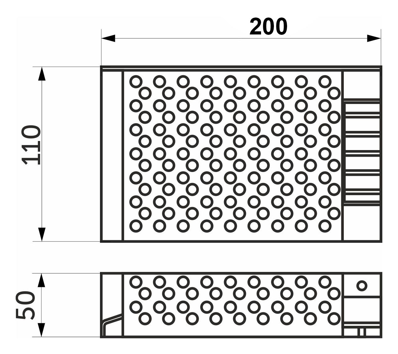 Используется для понижения рабочего напряжения с 220 В переменного тока до 12 В постоянного для светодиодных лент и светодиодных светильников.