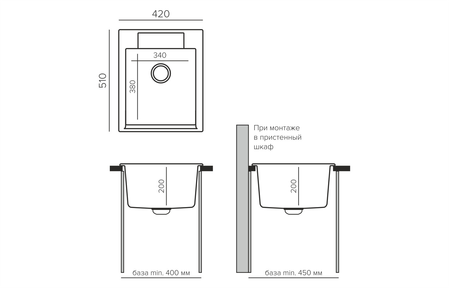 - Минимальная кухонная база, мм 400
