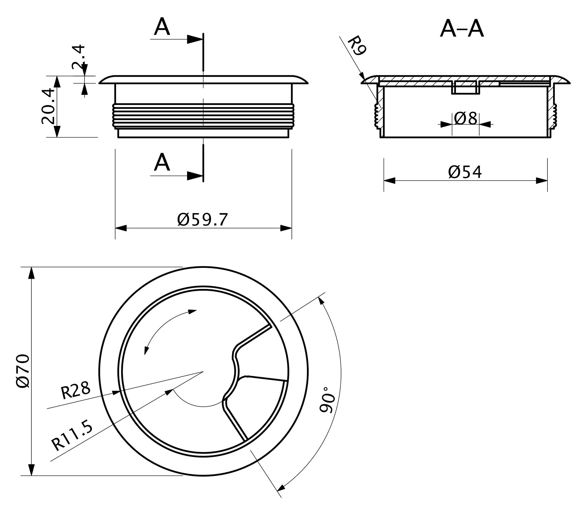 Габаритный диаметр изделия 70 мм, размеры отверстия в столешнице - d60 мм. Внутри пропуска есть съемная крышка, которая частично либо полностью закрывает отверстие для кабеля.