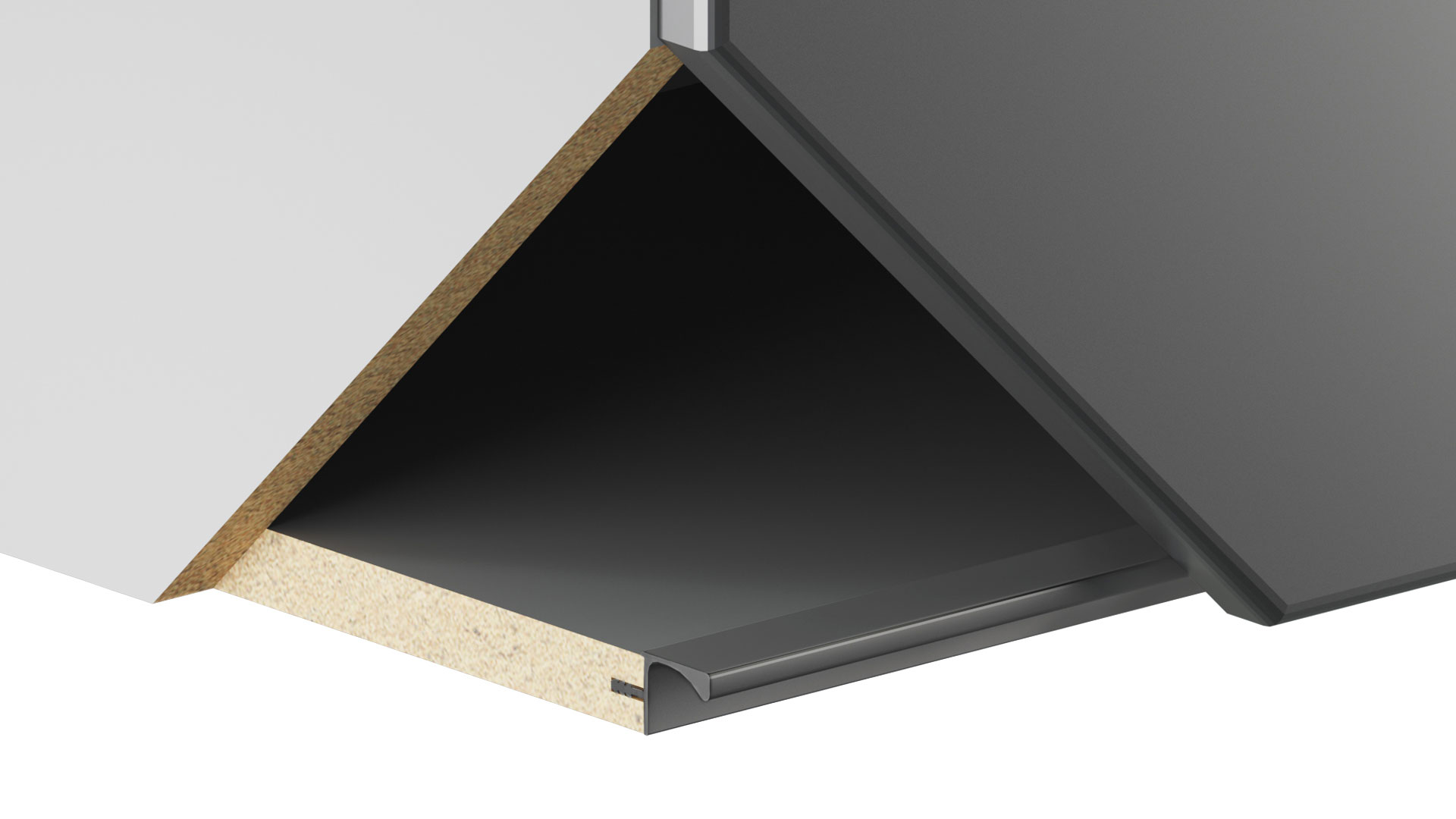 RP052 — профиль GOLA BALANCE для верхних баз мебельного гарнитура. Для установки ручки-профиля необходимо профрезеровать торец дна навесных модулей. Установленная ручка создаёт выемку для удобного захвата и открывания фасада рукой.
