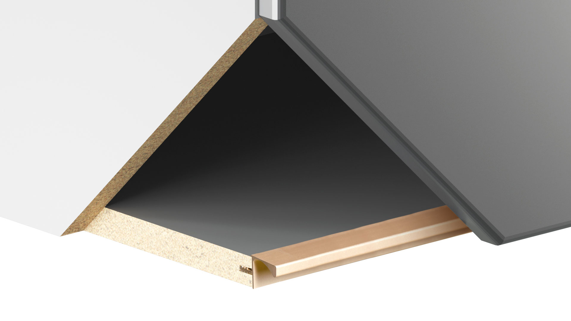 RP052 — профиль GOLA BALANCE для верхних баз мебельного гарнитура. Для установки ручки-профиля необходимо профрезеровать торец дна навесных модулей. Установленная ручка создаёт выемку для удобного захвата и открывания фасада рукой.