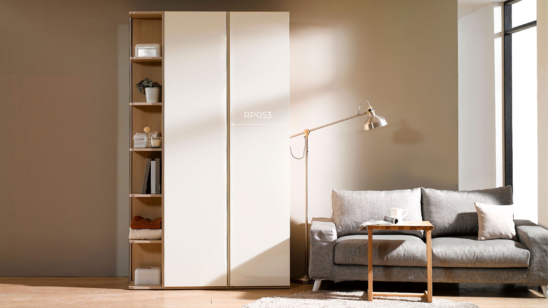RP053 устанавливается по центру между двумя вертикальными распашными фасадами, обеспечивая доступ к обоим одновременно. Модель станет отличным решением для минималистичных гарнитуров для кухонь, спален, гостиных и прихожих.
